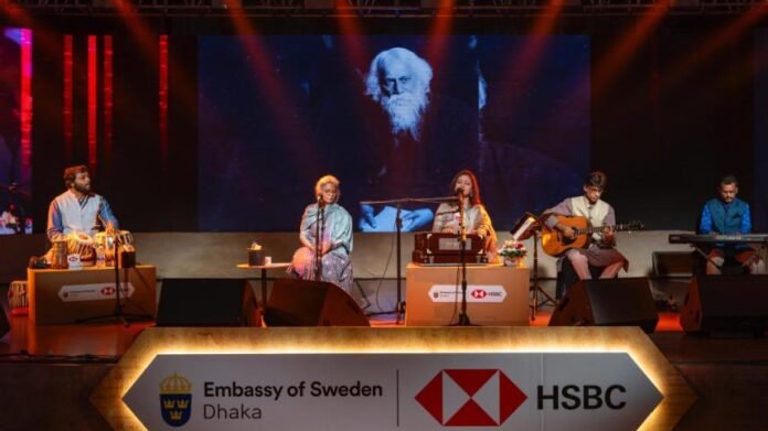 সুইডেন দূতাবাস ও এইচএসবিসি বাংলাদেশের যৌথ আয়োজনে অনুষ্ঠিত ‘আলোকের এই ঝর্‌না-ধারায়’ শিরোনামে এক বিশেষ অনুষ্ঠানে সোমবার সন্ধ্যায় সেই মেলবন্ধন এক অনন্য মর্যাদা ও উচ্ছ্বাসে প্রাণ পেয়েছিল। শেরাটন ঢাকার গ্র্যান্ড বলরুমে আয়োজিত এই সন্ধ্যা রবীন্দ্রনাথকে কেবল ‘বিশ্বকবি’ হিসেবেই নয়, বরং নিত্যজীবনের দার্শনিক হিসেবে তুলে ধরেছিল, যার সৃষ্টিকর্ম প্রেম, বেদনা, আত্মপরিচয় আর প্রতিদিনের সাধারণ মুহূর্তগুলো নতুন করে ভাবতে শেখায়।